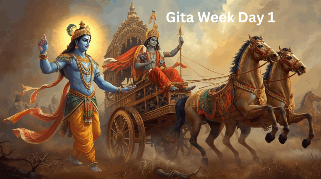 “Welcome to this series on the Gita… we’ll be covering roughly … the main points, the most important philosophical concepts. This is Kalyug, and in Kalyug, Bhakti is recommended above all else… the only path to God which is possible to follow in Kalyug. Gita is said to be the essence of Vedic teachings… Veda is the foundation of all Hindu scriptures. Whatever saint comes, even if Bhagwan himself comes and says something which is Ved Virud… it is unacceptable.”